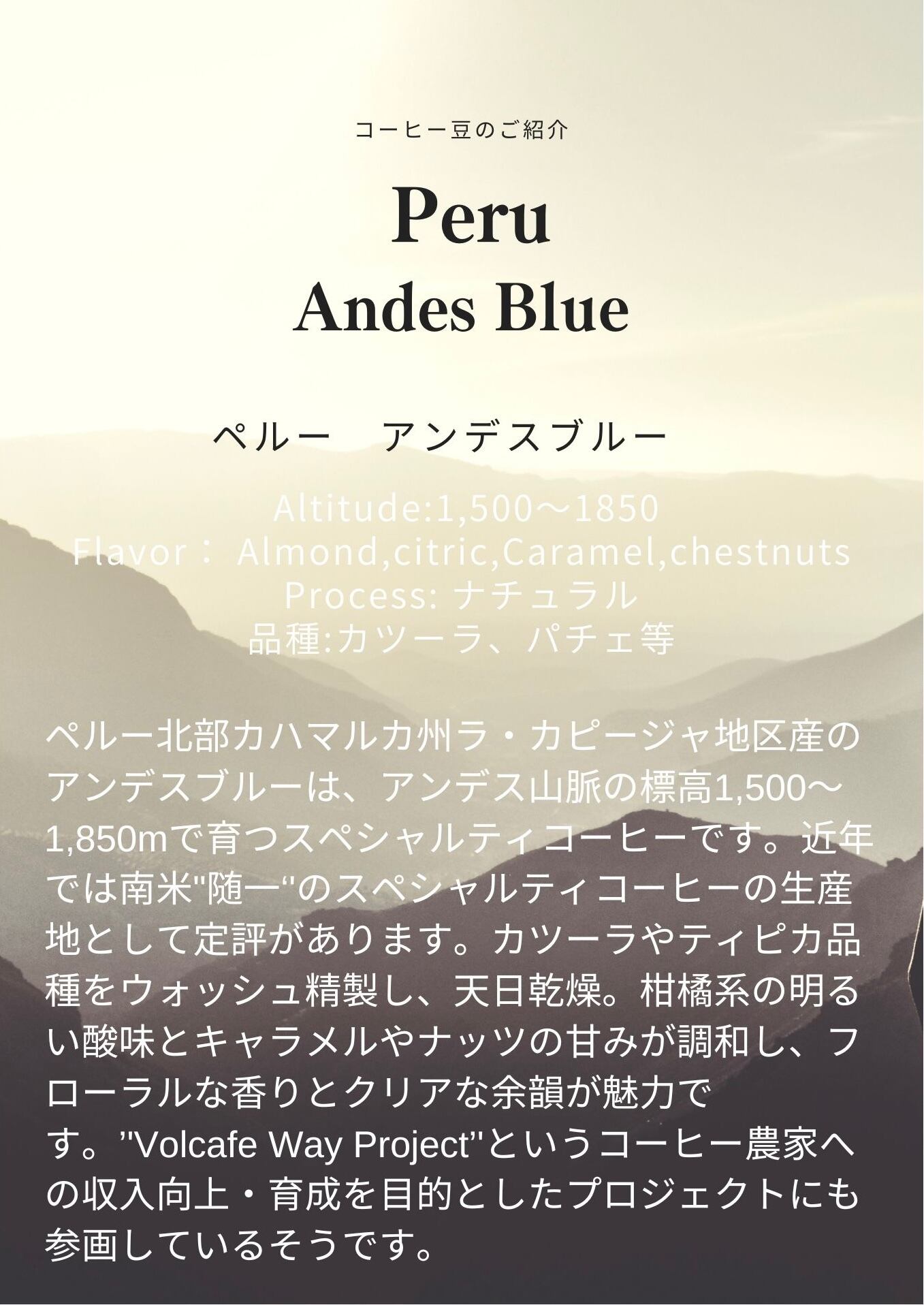 ペルー北部カハマルカ州ラ・カピージャ地区産のアンデスブルーは、アンデス山脈の標高1,500~1,850mで育つスペシャルティコーヒーです。近年では南米"随一‘'のスペシャルティコーヒーの生産地として定評があります。カツーラやティピカ品種をウォッシュ精製し、天日乾燥。柑橘系の明るい酸味とキャラメルやナッツの甘みが調和し、フローラルな香りとクリアな余韻が魅力です。’'Volcafe Way Project’'というコーヒー農家への収入向上・育成を目的としたプロジェクトにも参画しているそうです。