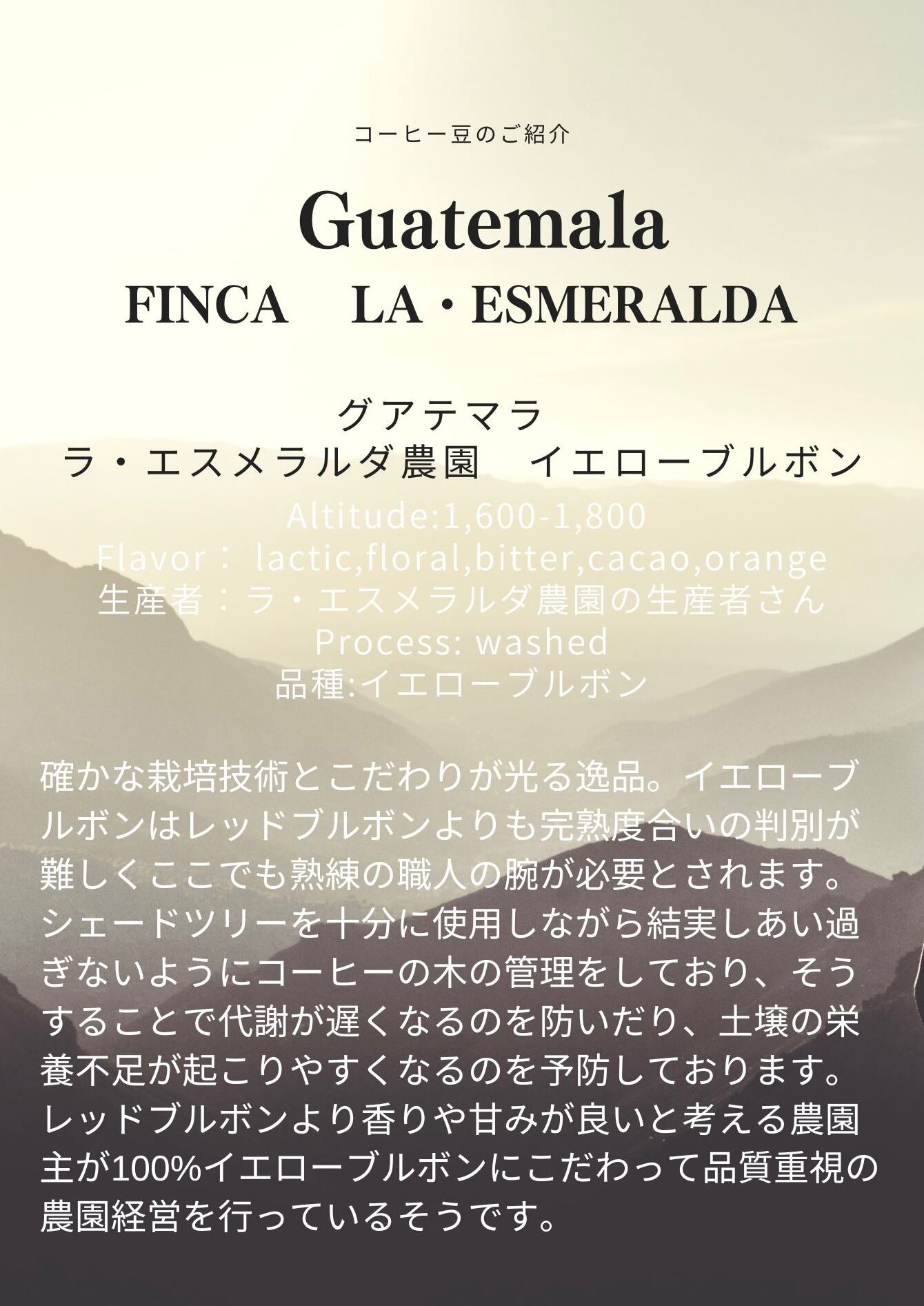 確かな栽培技術とこだわりが光る逸品。イエローブルボンはレッドブルボンよりも完熟度合いの判別が難しくここでも熟練の職人の腕が必要とされます。シェードツリーを十分に使用しながら結実しあい過ぎないようにコーヒーの木の管理をしており、そうすることで代謝が遅くなるのを防いだり、土壌の栄養不足が起こりやすくなるのを予防しております。レッドブルボンより香りや甘みが良いと考える農園主が100%イエローブルボンにこだわって品質重視の農園経営を行っているそうです。