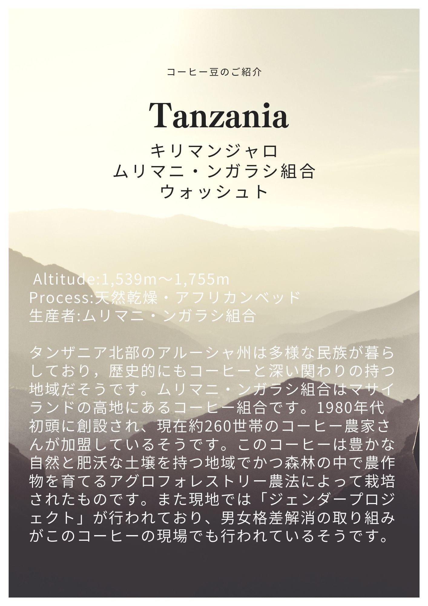 タンザニア北部のアルーシャ州は多様な民族が暮らしており,歴史的にもコーヒーと深い関わりの持つ地域だそうです。ムリマニ・ンガラシ組合はマサイランドの高地にあるコーヒー組合です。1980年代初頭に創設され、現在約260世帯のコーヒー農家さんが加盟しているそうです。このコーヒーは豊かな自然と肥沃な土壌を持つ地域でかつ森林の中で農作物を育てるアグロフォレストリー農法によって栽培されたものです。また現地では「ジェンダープロジェクト」が行われており、男女格差解消の取り組みがこのコーヒーの現場でも行われているそうです。